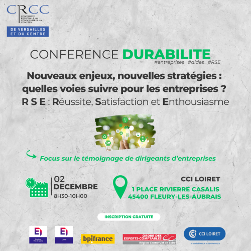 2 décembre 2025 8h30 à 10h00 CCI Loiret 1 place Rivierre-Casalis 45400 Fleury-les-AubraisInscription : https://www.crcc-versailles.fr/evenements/nouveaux-enjeux-nouvelles-strategies-quelles-voies-suivre-pour-les-entreprises/